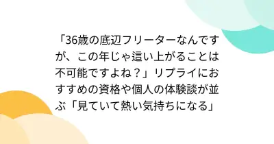 「36歳の底辺フリーターなんですが、この年じゃ這い上がることは不可能ですよね?」リプライにおすすめの資格や個人の体験談が並ぶ「見ていて熱い気持ちになる」