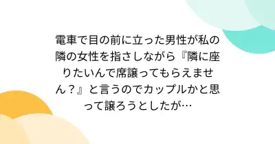 電車で目の前に立った男性が私の隣の女性を指さしながら『隣に座りたいんで席譲ってもらえません?』と言うのでカップルかと思って譲ろうとしたが…