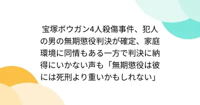 宝塚ボウガン4人殺傷事件、犯人の男の無期懲役判決が確定、家庭環境に同情もある一方で判決に納得にいかない声も「無期懲役は彼には死刑より重いかもしれない」