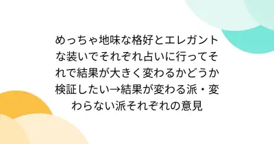 めっちゃ地味な格好とエレガントな装いでそれぞれ占いに行ってそれで結果が大きく変わるかどうか検証したい→結果が変わる派・変わらない派それぞれの意見