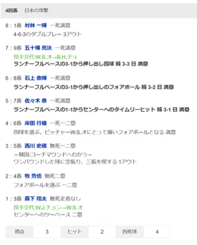 【韓国対侍ジャパン】侍ジャパン、4回表に佐々木のタイムリーと二者連続押し出しで3点を取り同点に追いつく!!!!!!!!!!!!!!!!!!!!!