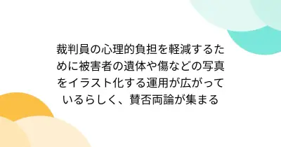 裁判員の心理的負担を軽減するために被害者の遺体や傷などの写真をイラスト化する運用が広がっているらしく、賛否両論が集まる
