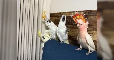 飼い主が何か新しいものを持ってくるたびに百点満点のリアクションで反応するオウムたち「こういう絵を見たことある気がする」