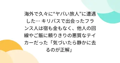 海外で久々に“ヤバい旅人”に遭遇した… キリバスで出会ったフランス人は宿も金もなく、他人の回線やご飯に頼りきりの悪質なテイカーだった「気づいたら静かに去るのが正解」
