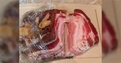 『Солонина』という要するに豚の塩漬け…このまま切って食べるんだよと言われたんやけどあまりにも見た目が生っぽすぎて不安になる「明らかにみずみずしいやんw」
