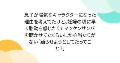 息子が陽気なキャラクターになった理由を考えてたけど、妊婦の頃に早く胎動を感じたくてマツケンサンバを聴かせてたくらいしか心当たりがない「踊らせようとしてたってこと?」