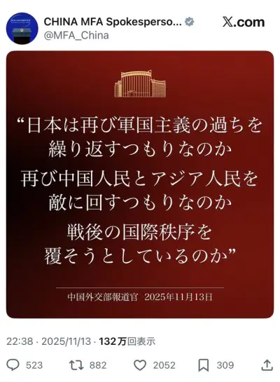 中国外務省、日本人にXの画像付きポストで警告⚠