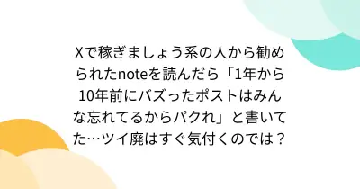Xで稼ぎましょう系の人から勧められたnoteを飛んだら「1年から10年前にバズったポストはみんな忘れてるからパクれ」と書いてた…ツイ廃はすぐ気付くのでは?