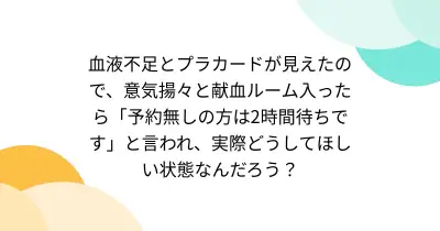 血液不足とプラカードが見えたので、意気揚々と献血ルーム入ったら「予約無しの方は2時間待ちです」と言われ、実際どうしてほしい状態なんだろう?