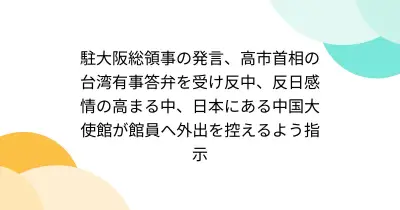 駐大阪総領事の発言、高市首相の台湾有事答弁を受け反中、反日感情の高まる中、日本にある中国大使館が館員へ外出を控えるよう指示