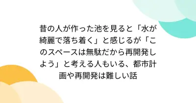 昔の人が作った池を見ると「水が綺麗で落ち着く」と感じるが「このスペースは無駄だから再開発しよう」と考える人もいる、都市計画や再開発は難しい話