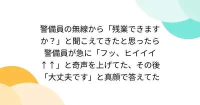 警備員の無線から「残業できますか?」と聞こえてきたと思ったら警備員が急に「フッ、ヒイイイ↑↑」と奇声を上げてた、その後「大丈夫です」と真顔で答えてた