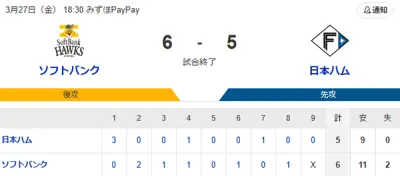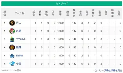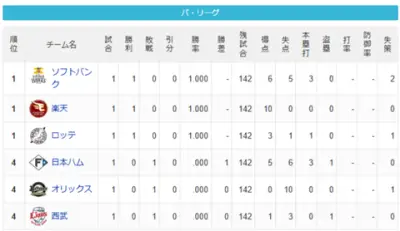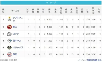【3/27】パ・リーグ順位表|開幕戦黒星…日ハムの現在順位がこちら