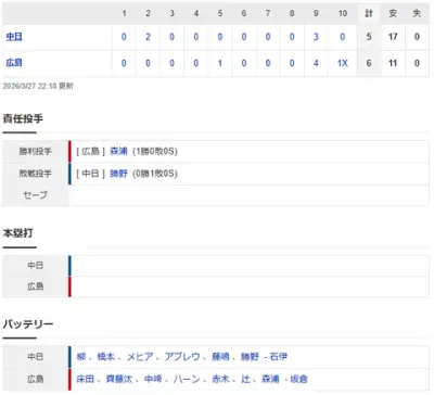 【広島対中日開幕戦】広島ドラ3勝田、延長10回裏にサヨナラタイムリー!!!!!!!!!!!!!!!!!!!!!