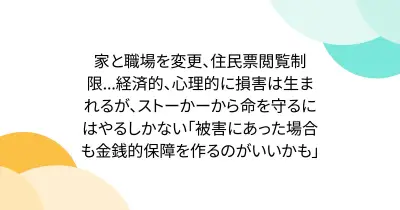 家と職場を変更、住民票閲覧制限...経済的、心理的に損害は生まれるが、ストーかーから命を守るにはやるしかない「被害にあった場合も金銭的保障を作るのがいいかも」