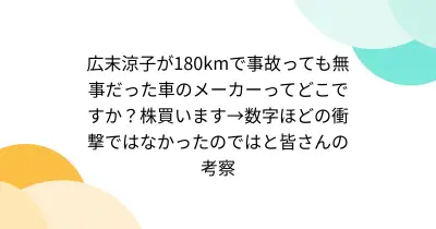 広末涼子が180kmで事故っても無事だった車のメーカーってどこですか?株買います→数字ほどの衝撃ではなかったのではと皆さんの考察