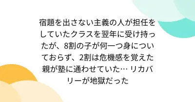 宿題を出さない主義の人が担任をしていたクラスを翌年に受け持ったが、8割の子が何一つ身についておらず、2割は危機感を覚えた親が塾に通わせていた… リカバリーが地獄だった