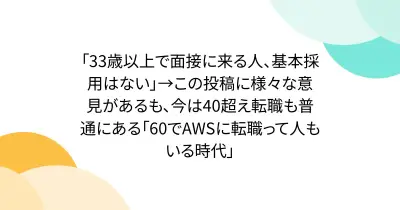 「33歳以上で面接に来る人、基本採用はない」→この投稿に様々な意見があるも、今は40超え転職も普通にある「60でAWSに転職って人もいる時代」