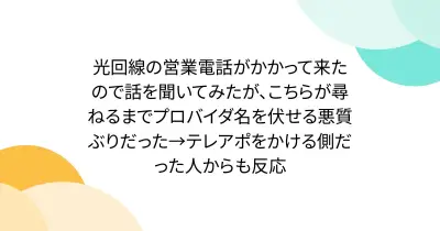 光回線の営業電話がかかって来たので話を聞いてみたが、こちらが尋ねるまでプロバイダ名を伏せる悪質ぶりだった→テレアポをかける側だった人からも反応
