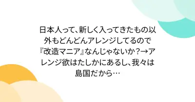 日本人って、新しく入ってきたもの以外もどんどんアレンジしてるので『改造マニア』なんじゃないか?→アレンジ欲はたしかにあるし、我々は島国だから…