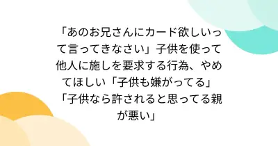 「あのお兄さんにカード欲しいって言ってきなさい」子供を使って他人に施しを要求する行為、やめてほしい「子供も嫌がってる」「子供なら許されると思ってる親が悪い」