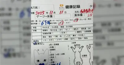 特徴的なおヒゲ模様がある猫を動物病院に連れて行ったら先生がカルテの身体検査欄のところにヒゲ模様を図示して”カワイイ”って書いてた