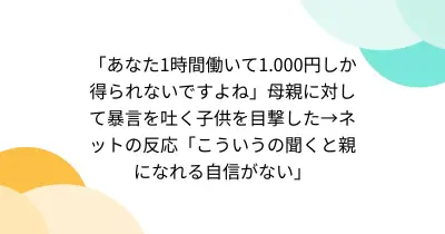 「あなた1時間働いて1.000円しか得られないですよね」母親に対して暴言を吐く子供を目撃した→ネットの反応「こういうの聞くと親になれる自信がない」