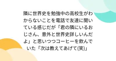 隣に世界史を勉強中の高校生がわからないことを電話で友達に聞いている感じだが「君の隣にいるおじさん、意外と世界史詳しいんだよ」と思いつつコーヒーを飲んでいた「次は教えてあげて(笑)」