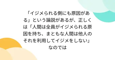 「イジメられる側にも原因がある」という論説があるが、正しくは「人間は全員がイジメられる原因を持ち、まともな人間は他人のそれを利用してイジメをしない」なのでは