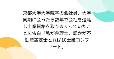 京都大学大学院卒の会社員、大学同期に会ったら数年で会社を退職し士業資格を取りまくっていたことを告白「私が弁理士、誰かが不動産鑑定士とれば10士業コンプリート」