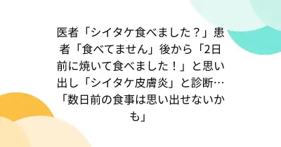 医者「シイタケ食べました?」患者「食べてません」後から「2日前に焼いて食べました!」と思い出し「シイタケ皮膚炎」と診断…「数日前の食事は思い出せないかも」