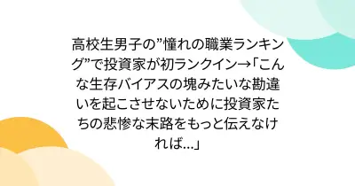 高校生男子の”憧れの職業ランキング”で投資家が初ランクイン→「こんな生存バイアスの塊みたいな勘違いを起こさせないために投資家たちの悲惨な末路をもっと伝えなければ...」