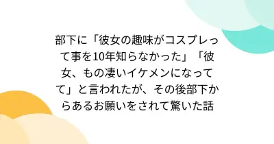 部下に「彼女の趣味がコスプレって事を10年知らなかった」「彼女、もの凄いイケメンになってて」と言われたが、その後部下からあるお願いをされて驚いた話