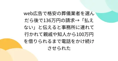 web広告で格安の葬儀業者を選んだら後で136万円の請求→「払えない」と伝えると事務所に連れて行かれて親戚や知人から100万円を借りられるまで電話をかけ続けさせられた