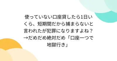 使っていない口座貸したら1日いくら、短期間だから捕まらないと言われたが犯罪になりますよね?→だめだめ絶対だめ「口座一つで地獄行き」