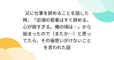 父に仕事を辞めることを話した時、「近頃の若者はすぐ辞める、心が弱すぎる。俺の頃は…」から始まったので(またか…)と思ってたら、その後思いがけないことを言われた話