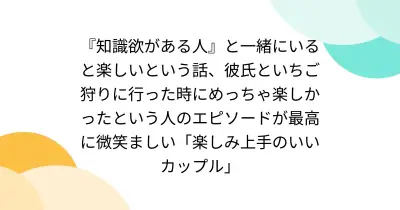 『知識欲がある人』と一緒にいると楽しいという話、彼氏といちご狩りに行った時にめっちゃ楽しかったという人のエピソードが最高に微笑ましい「楽しみ上手のいいカップル」