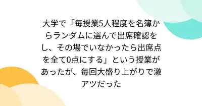 大学で「毎授業5人程度を名簿からランダムに選んで出席確認をし、その場でいなかったら出席点を全て0点にする」という授業があったが、毎回大盛り上がりで激アツだった