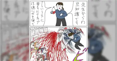 「今思い出すとジワジワくる先生の失敗」ケッチャップを遠心力でなんとかしようとするライフハックを試そうとして大惨事にするエピソードが絵的におもろい