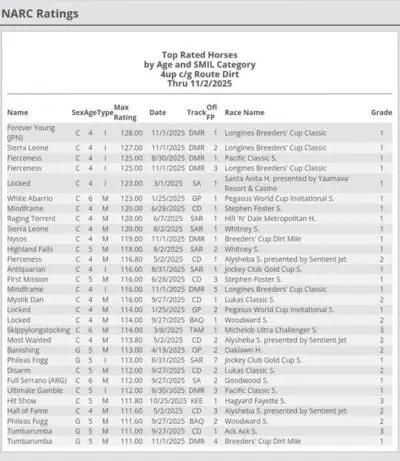フォーエバーヤングのBCクラシックのレーティングは128