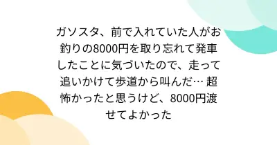 ガソスタ、前で入れていた人がお釣りの8000円を取り忘れて発車したことに気づいたので、走って追いかけて歩道から叫んだ… 超怖かったと思うけど、8000円渡せてよかった