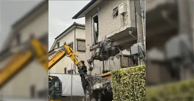 密集した住宅地で囲いもせず突然解体工事が始まった...先に1階部分をゴッソリ削っているせいで2階が崩落してきそう→業者の看板なども一切なし、詳しい人教えて