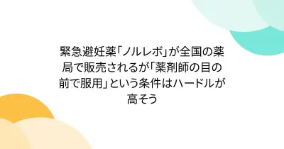 緊急避妊薬「ノルレボ」が全国の薬局で販売されるが「薬剤師の目の前で服用」という条件はハードルが高そう