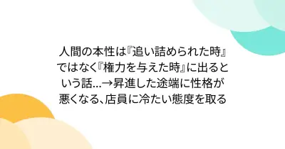 人間の本性は『追い詰められた時』ではなく『権力を与えた時』に出るという話...→昇進した途端に性格が悪くなる、店員に冷たい態度を取る