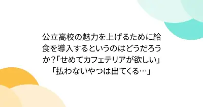 公立高校の魅力を上げるために給食を導入するというのはどうだろうか?「せめてカフェテリアが欲しい」「払わないやつは出てくる…」