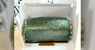 すごすぎの恵方巻き、ケーキみたいな箱にみっちり詰まってて面白かった「イオン、恵方巻きでトチ狂いがち」「これ食べ終わるまで黙るの鬼畜」