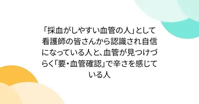 「採血がしやすい血管の人」として看護師の皆さんから認識され自信になっている人と、血管が見つけづらく「要・血管確認」で辛さを感じている人