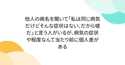 他人の病名を聞いて「私は同じ病気だけどそんな症状はない、だから嘘だ」と言う人がいるが、病気の症状や程度なんて当たり前に個人差がある