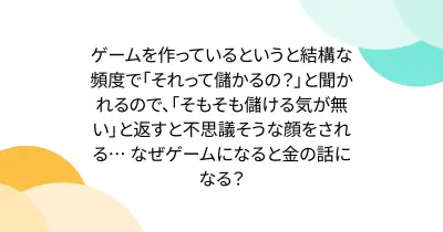 ゲームを作っているというと結構な頻度で「それって儲かるの?」と聞かれるので、「そもそも儲ける気が無い」と返すと不思議そうな顔をされる… なぜゲームになると金の話になる?