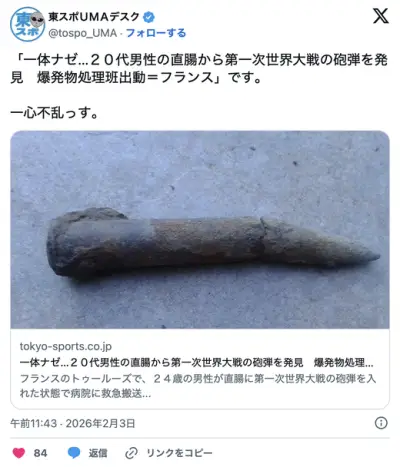 20代男性の直腸から第一次世界大戦の砲弾を発見 爆発物処理班出動